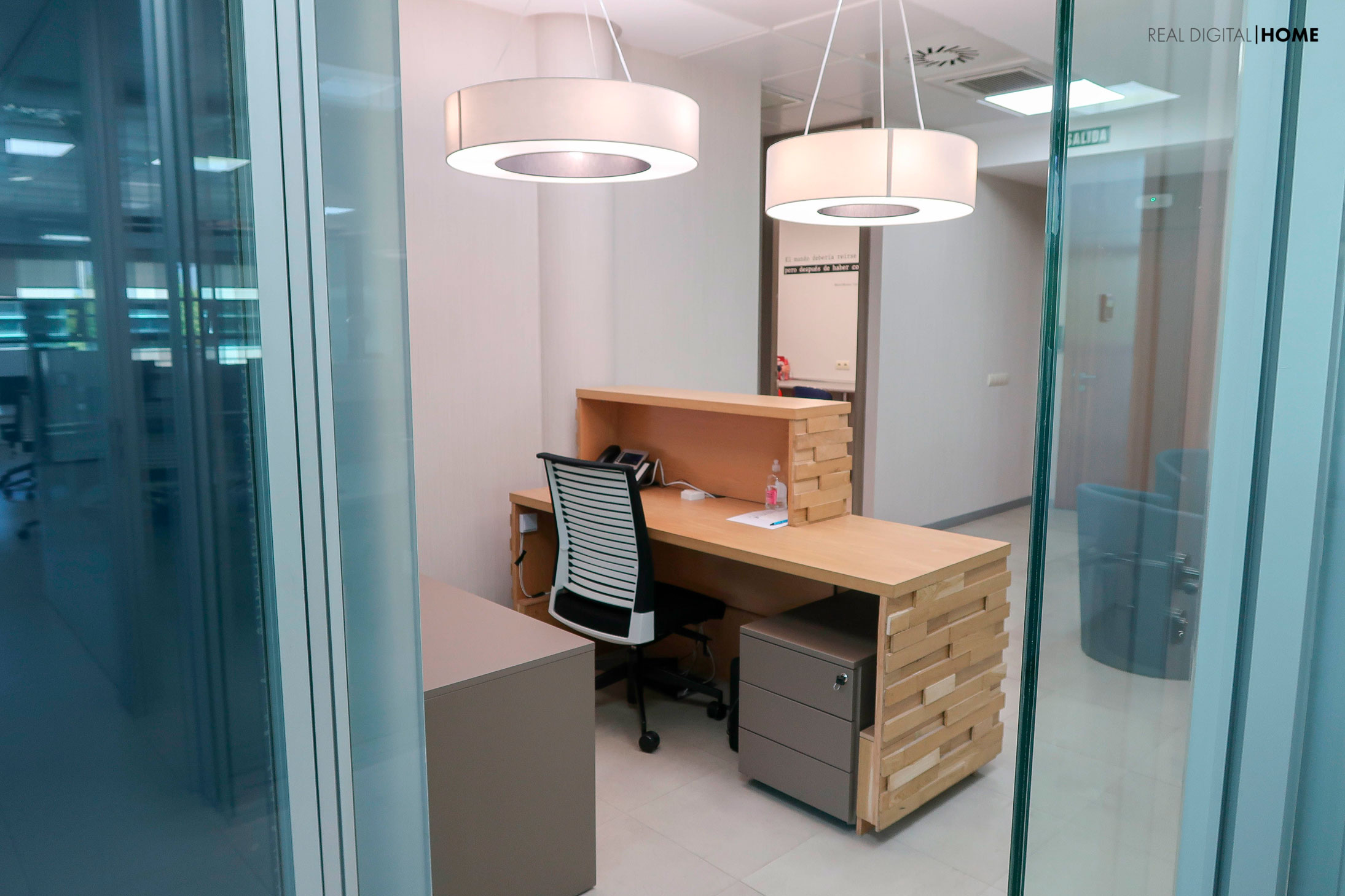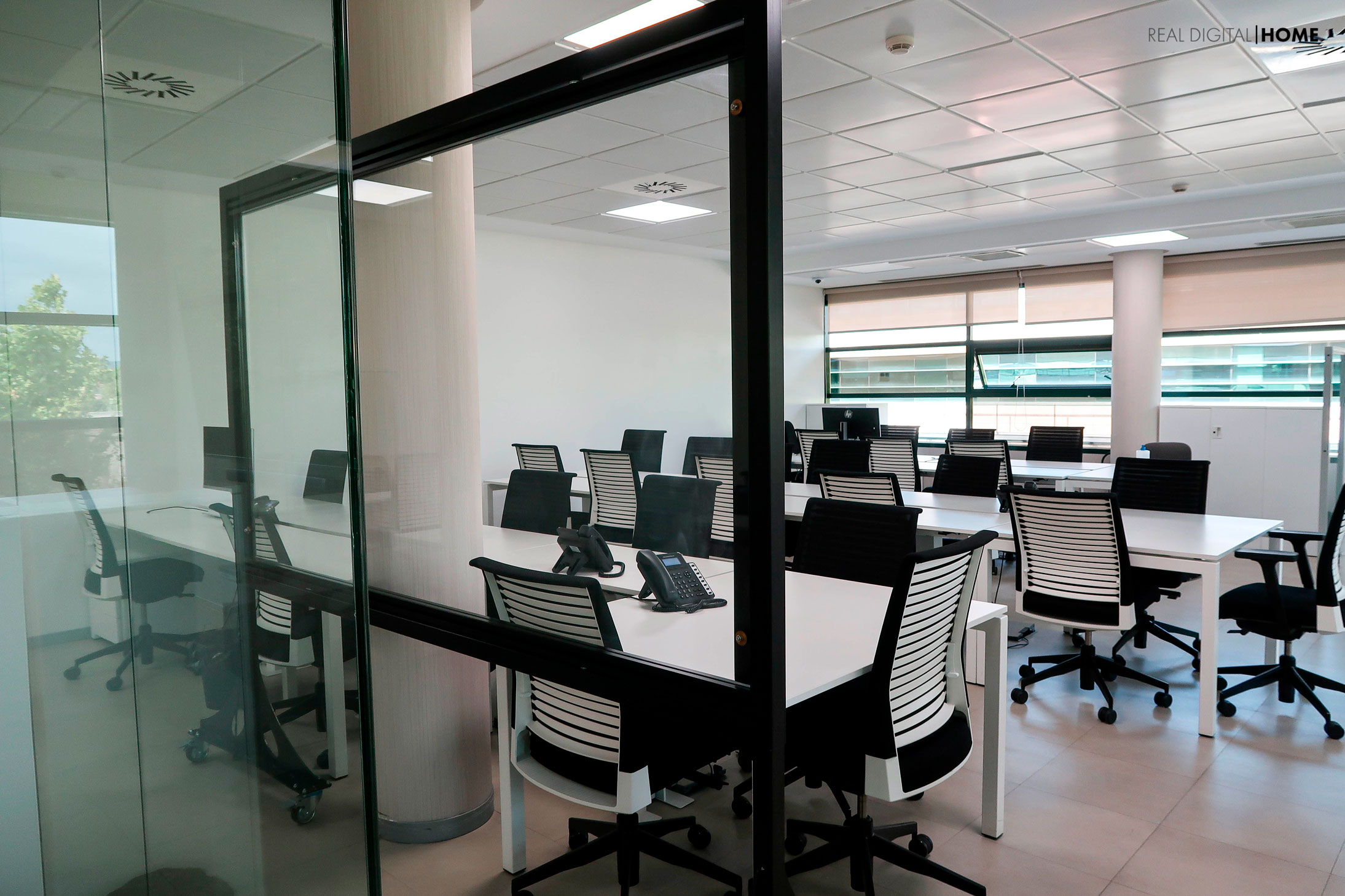 Zona diáfana para la zona de trabajo y división de mamparas de cristal para 5 despachos y sala de reuniones, totalmente insonorizados.