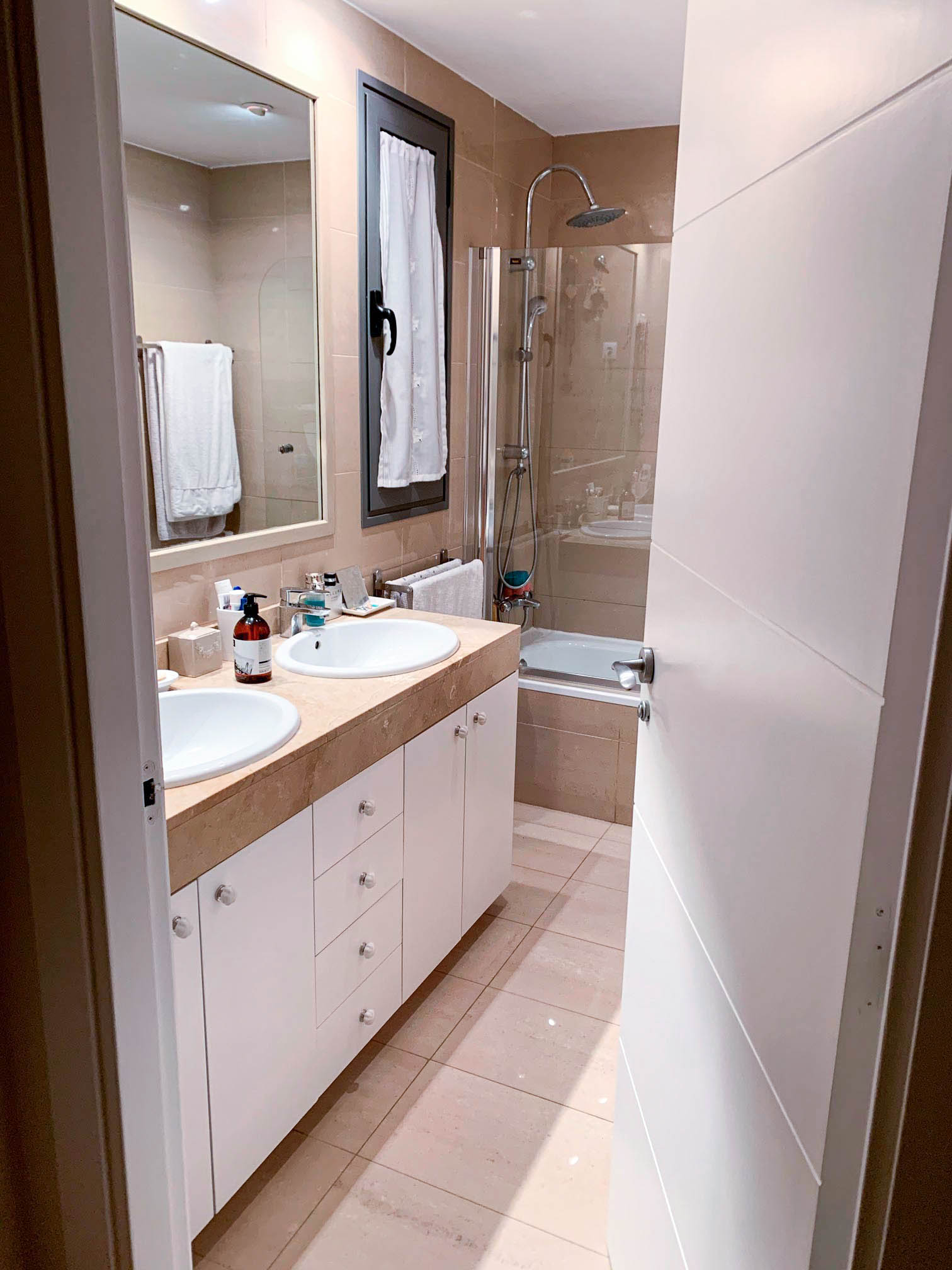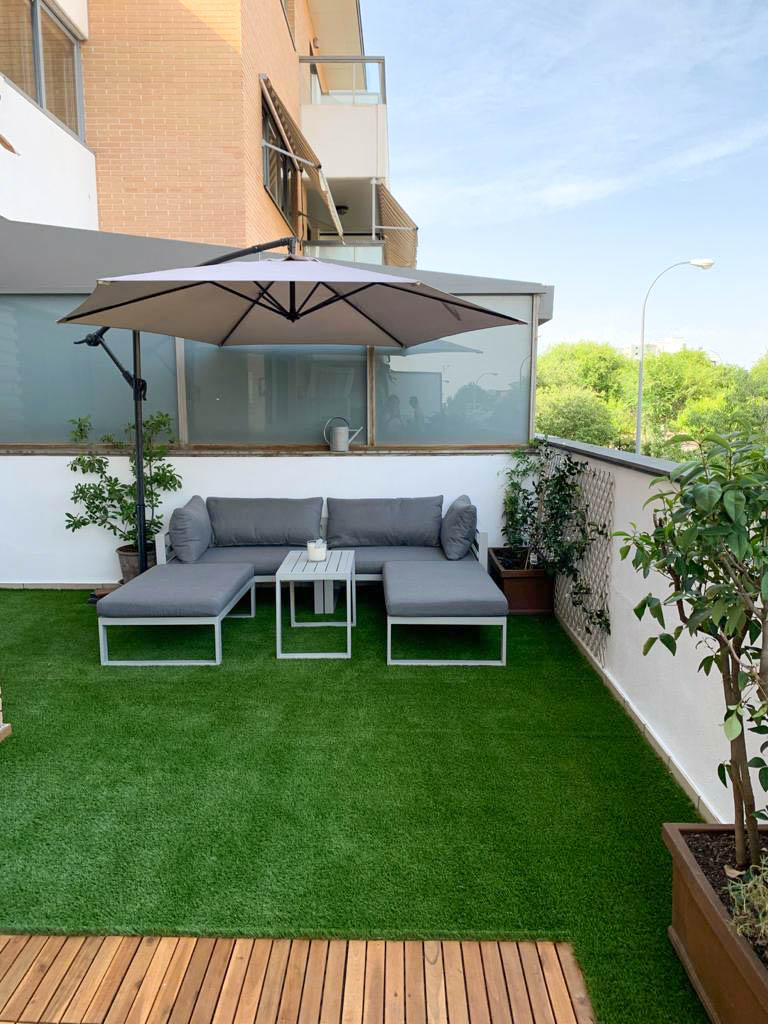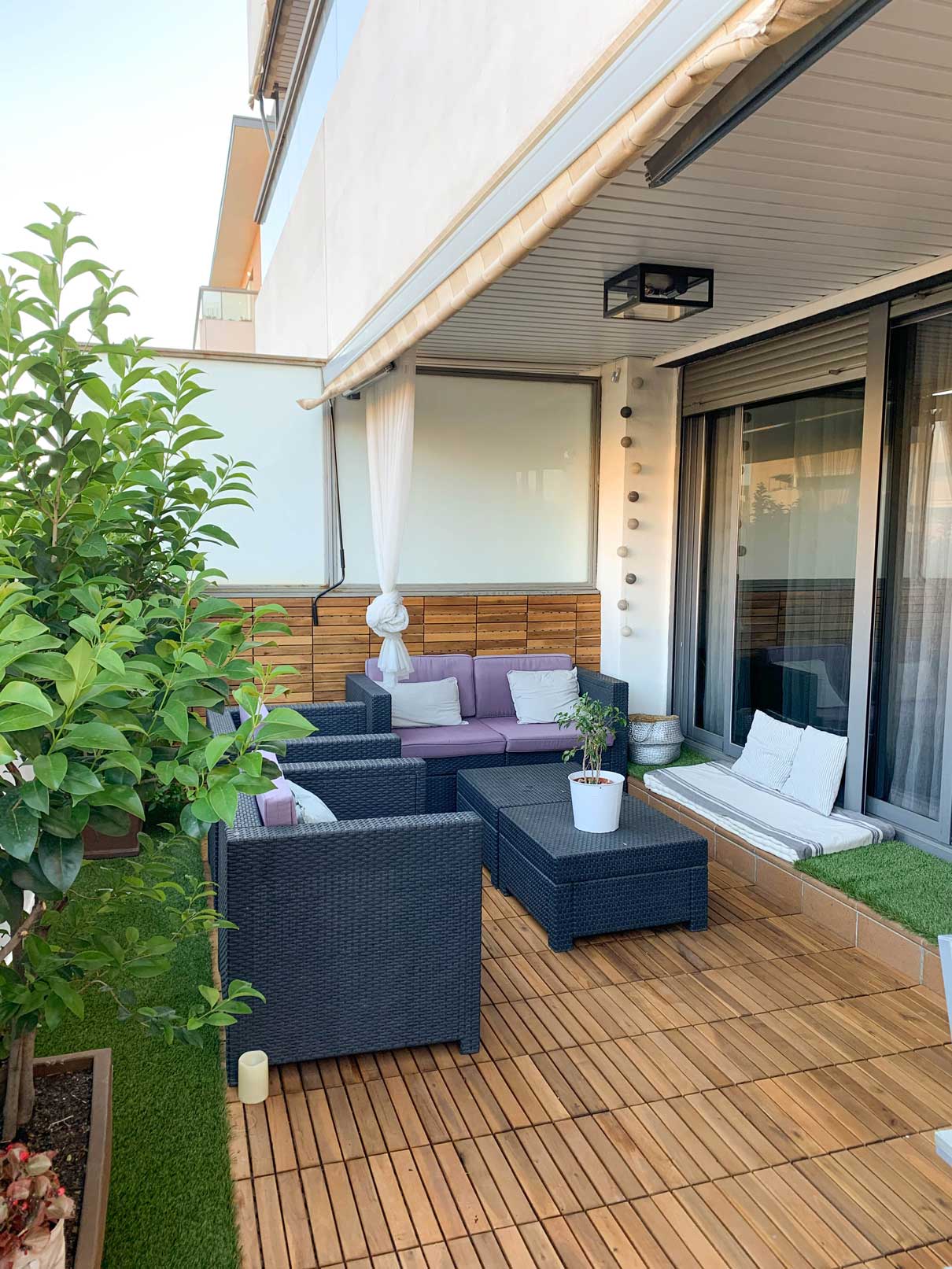 El piso está en perfecto estado y muy cuidado, listo para entrar a vivir. Tiene 3 habitaciones, todas exteriores, (la principal en suite) y las otras dos habitaciones comparten el otro baño. El amplio salón de 30m2 da acceso a la preciosa terraza de 40m2, recientemente decorada con césped artificial de primera calidad, suelo de madera y ducha exterior, dispone de toldos (el grande es eléctrico). Cocina espaciosa que da acceso a un patio interior de 8 m2. Todas las habitaciones tienen armarios empotrados vestidos. La carpintería interior está lacada en blanco con rodapiés de 11 cm, recién puestos. El suelo es de tarima.