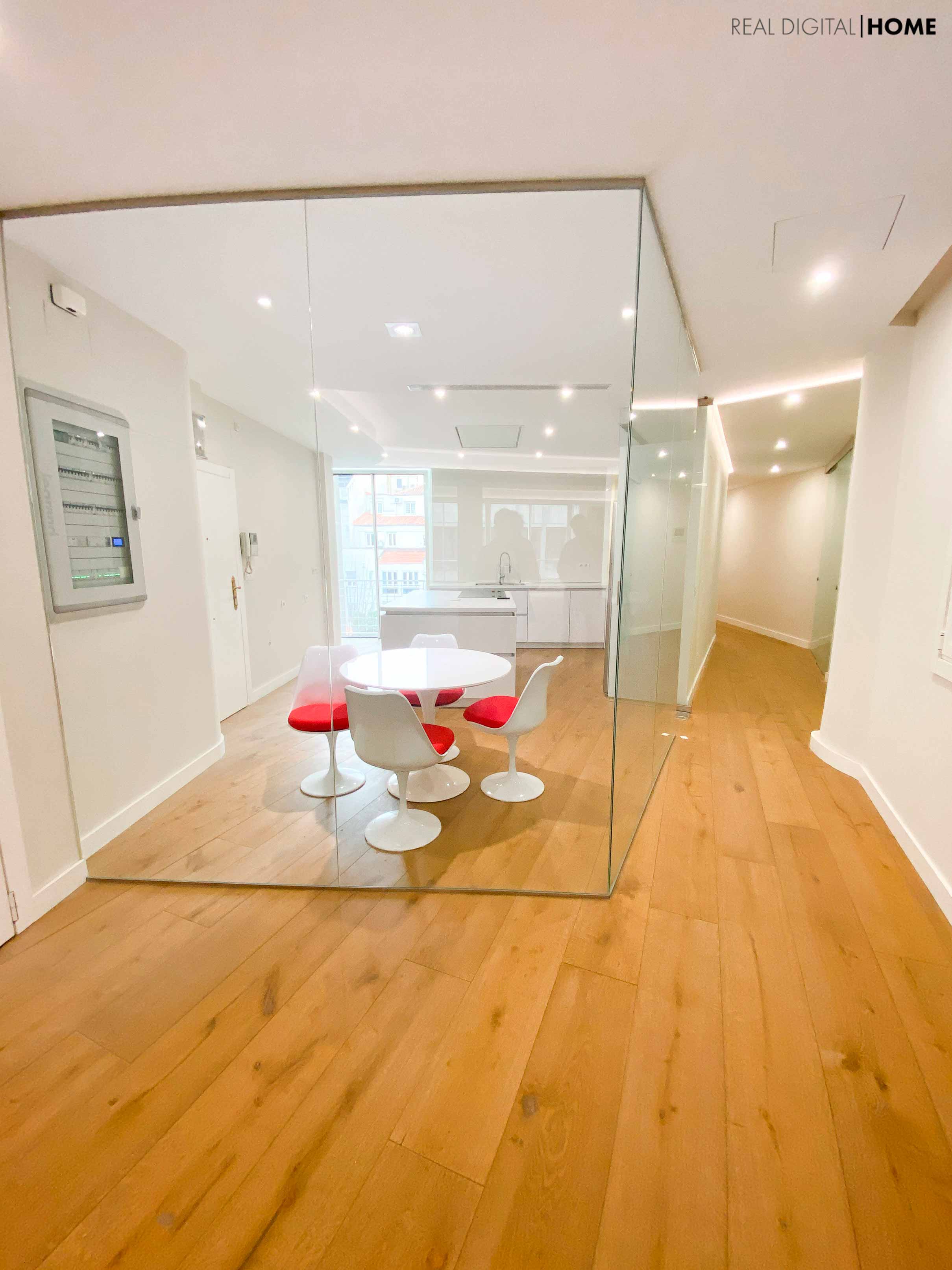 Según entramos en la vivienda, nos encontramos un imponente salón de más de 100m2 con enormes ventanales a la calle Recoletos. También encontramos una cocina acristalada de grandes dimensiones y acceso a la zona de servicio, compuesta por un dormitorio y un baño completo. También dispone de un aseo de cortesía junto al salón.