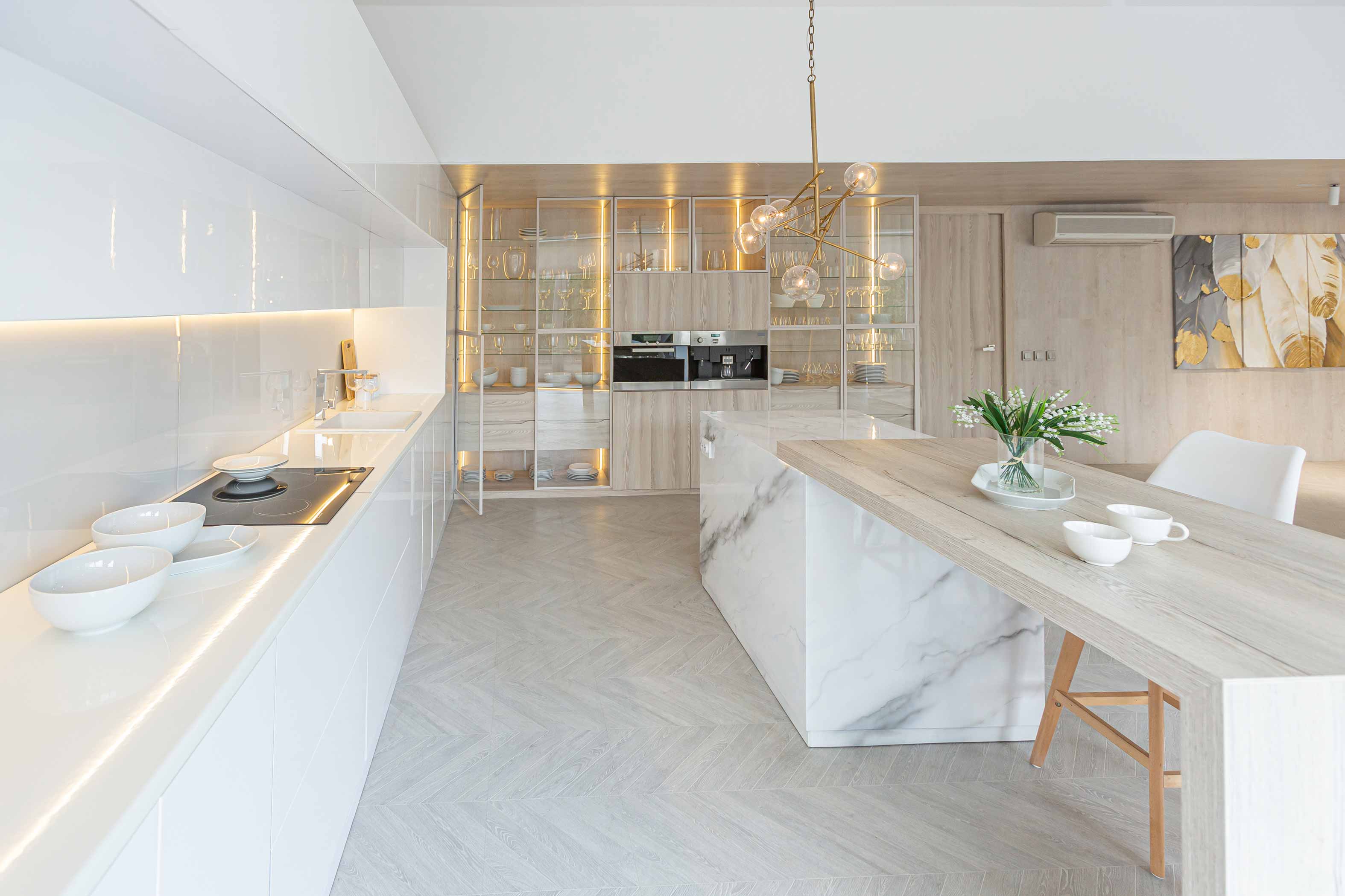Consta de un hall por el que se accede a un amplio salón-comedor con cocina integrada completamente equipada con electrodomésticos de última generación y barra con taburetes de diseño ideales para un desayuno o aperitivo. Además, contamos con un bonito y moderno aseo para invitados.